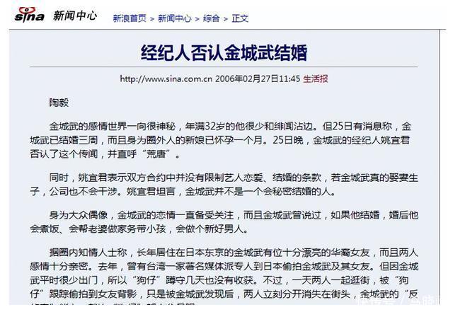 据悉两东说念主互助由来已久,金城武自出说念起等于对方带着,期间一直莫得换过牙东说念主。 这个音问一直传了好几年,但没什么实锤,他也莫得出来否定过。 2011年,金城武又被传出迎娶了一个日本妻子,又是姚宜君出往还话的:“仅仅庸碌一又友。”